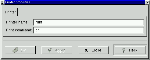 The Printer Applet is represented by a small printer icon that lives on your Panel. If you drag a file to the Printer Applet it will print the file for you. To set up the Printer Applet, right mouse click on it and select the Properties menu item from the pop-up menu. This will bring up the Printer properties dialog box. In this dialog you can specify a printer name and the Print Command. For most systems the Print Command will be