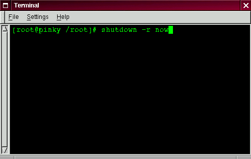 Summary: To shutdown or reboot from GNOME, from the login screen, go to Options => System => Halt or Reboot. From within your X session, go to Main Menu Button => Log out, Reboot or Halt. From the shell prompt: Log in as root, and type shutdown -r now (to reboot) or shutdown -h now (to halt).
